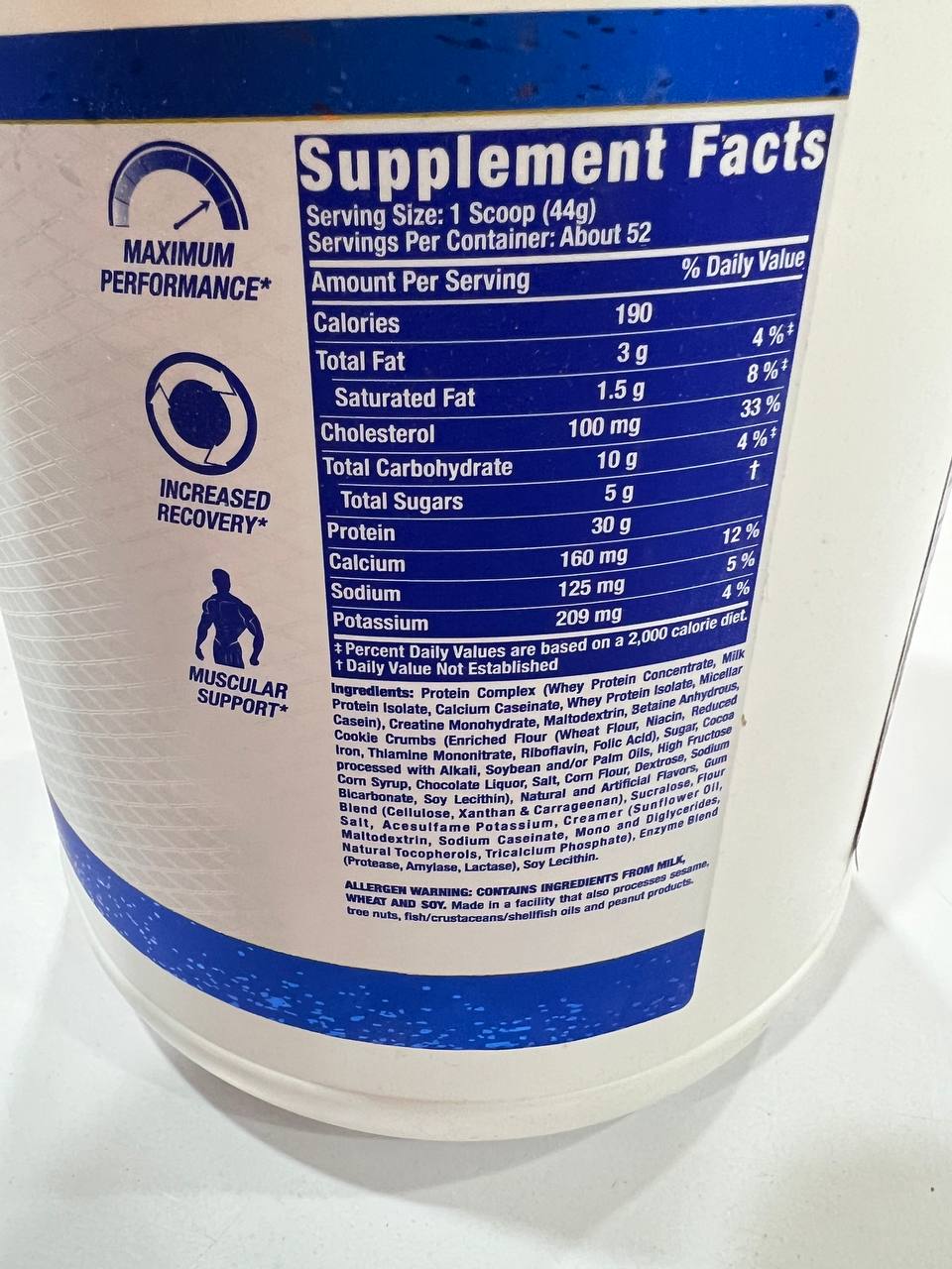 هر وعده ( 1 پیمانه ) حاوی 130 کالری ، 40 میلی گرم کلسترول ، 10 گرم کربوهیدرات ، 3/5 گرم چربی 30 گرم پروتئین و 5.5 گرم BCAA و 5 گرم کراتین