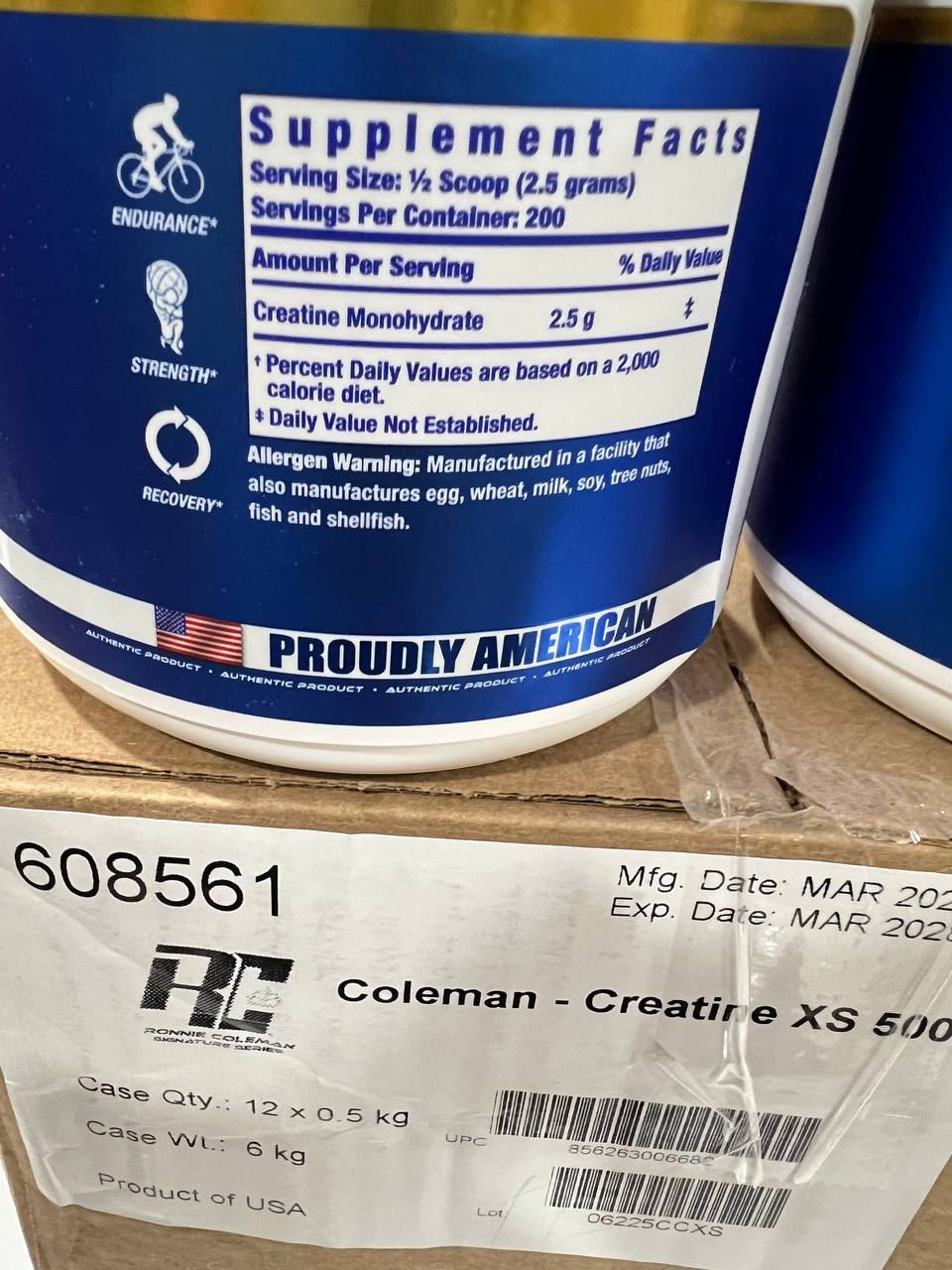 کراتین مونوهیدرات رونی کلمن از برند ronnie coleman حاوی 500 گرم و هر سروینگ از آن، شامل 2.5 گرم می باشد. یک پیمانه (5 گرم) از این کراتین را به 12 الی 16 قاشق غذاخوری آب یا نوشیدنی مورد علاقه خود اضافه کرده، به خوبی تکان دهید و مصرف کنید.